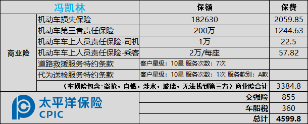 【太平洋产险】尊敬的客户您好,太平洋产险为您的爱车“浙B8DX78”报价:交强险 855 元,商业险 3384.8 元,总计 4599.8 元。其中机动车损失险 保额: 182630 元,保费: 2059.85 元、第三者责任险 保额: 2000000 元,保费: 1244.63 元、车上司机责任险 保额: 10000 元,保费: 22.5 元、车上乘客责任险 保额: 10000 元,保费: 57.82 元、道路救援服务特约条款 保费:0 元 、代为送检服务特约条款 保费:0 元 、车船税 360 元。以上价格仅供参考,最终价格以出单为准。祝您生活愉快。 回TD退订短信